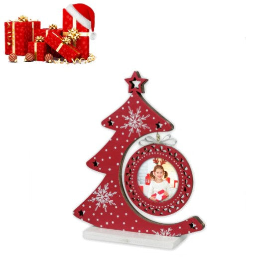 Zep Cornice Nestor Red in legno, colore rosso, sagonata a forma di albero di natale, con appeso una palla di natalia, con decoro traforato a stella e stampa bianca, a tema invernale, da tavolo, idea regalo originale, decorazione natalizia, regalo personalizzato.