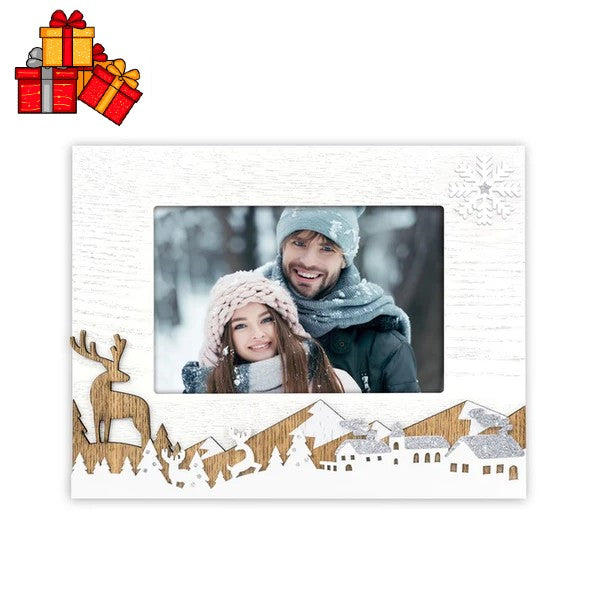 Cornice Zermatt in legno, colore bianco legno naturale e glitter argento, con decoro traforato e a rilievo, a tema invernale, da tavolo, idea regalo originale, decorazione natalizia, regalo personalizzato.