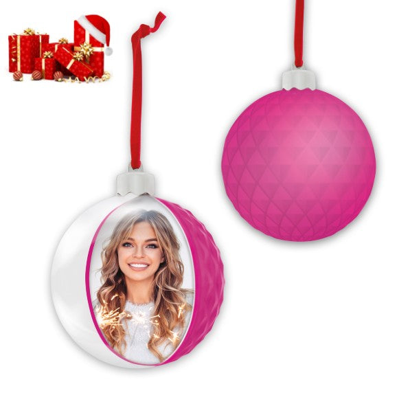 Zep Photo Christmas Diamond Violet, palla di natale con foto, in plastica metà di colore fucsia con decoro a rilievo e metà trasparente, personalizzabile con foto, da appendere, idea regalo originale, addobbo o decorazione natalizia, regalo personalizzato.
